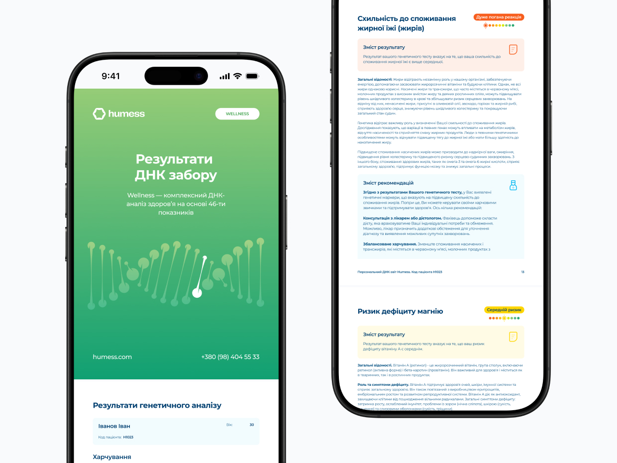 4.9Звернулася в Humess для здачі ДНК-тесту та отримала професійну консультацію за результатами. Дуже сподобалося що отримала не лише відповіді на свої запитання щодо здоров’я, а навіть більше! Окремо хочу відзначити онлайн-консультацію, де все пояснили доступно та зрозуміло, а також надали конкретні рекомендації для покращення здоров’я. В найближчий час знову звернуся для додаткових аналізів та підбору вітамінів. Тепер я точно знаю що саме потрібно моєму організму і як правильно діяти. Дякую за вашу роботу💜